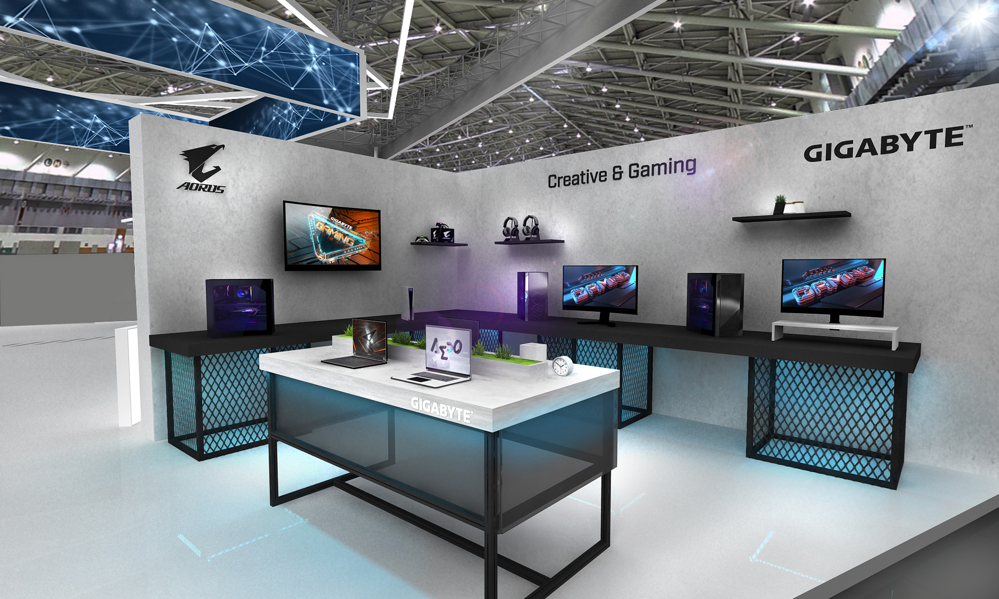 This booth surrounds the concept of From Edge to Cloud in the physical space of the booth for GIGABYTE, a major computer hardware manufacturer and distributor. In addition to the main theme of server room, each area includes details recreating different scenarios that showcase the contexts for each product presented.
